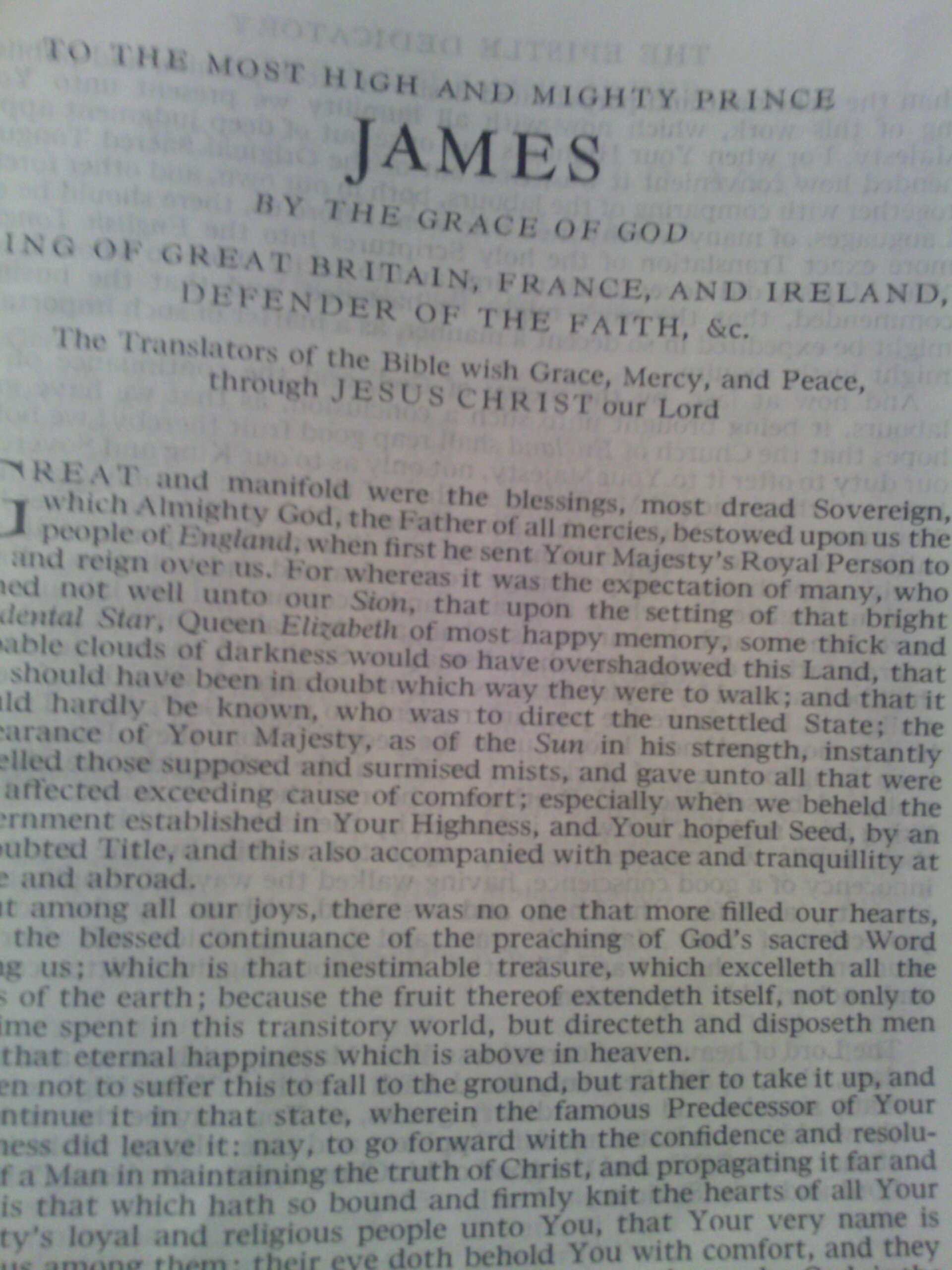 There are infinite arguments of this right Christian and religious affection in Your Majesty; but none is more forcible to declare it to others than the vehement and perpetuated desire of accomplishing and publishing of this work, which now with all humility we present unto Your Majesty. For when Your Highness had once out of deep judgment apprehended how convenient it was, that out of the Original Sacred Tongues, together with comparing of the labours, both in our own, and other foreign Languages, of many worthy men who went before us, there should be one more exact Translation of the holy Scriptures into the English Tongue; Your Majesty did never desist to urge and to excite those to whom it was commended, that the work might be hastened, and that the business might be expedited in so decent a manner, as a matter of such importance might justly require.